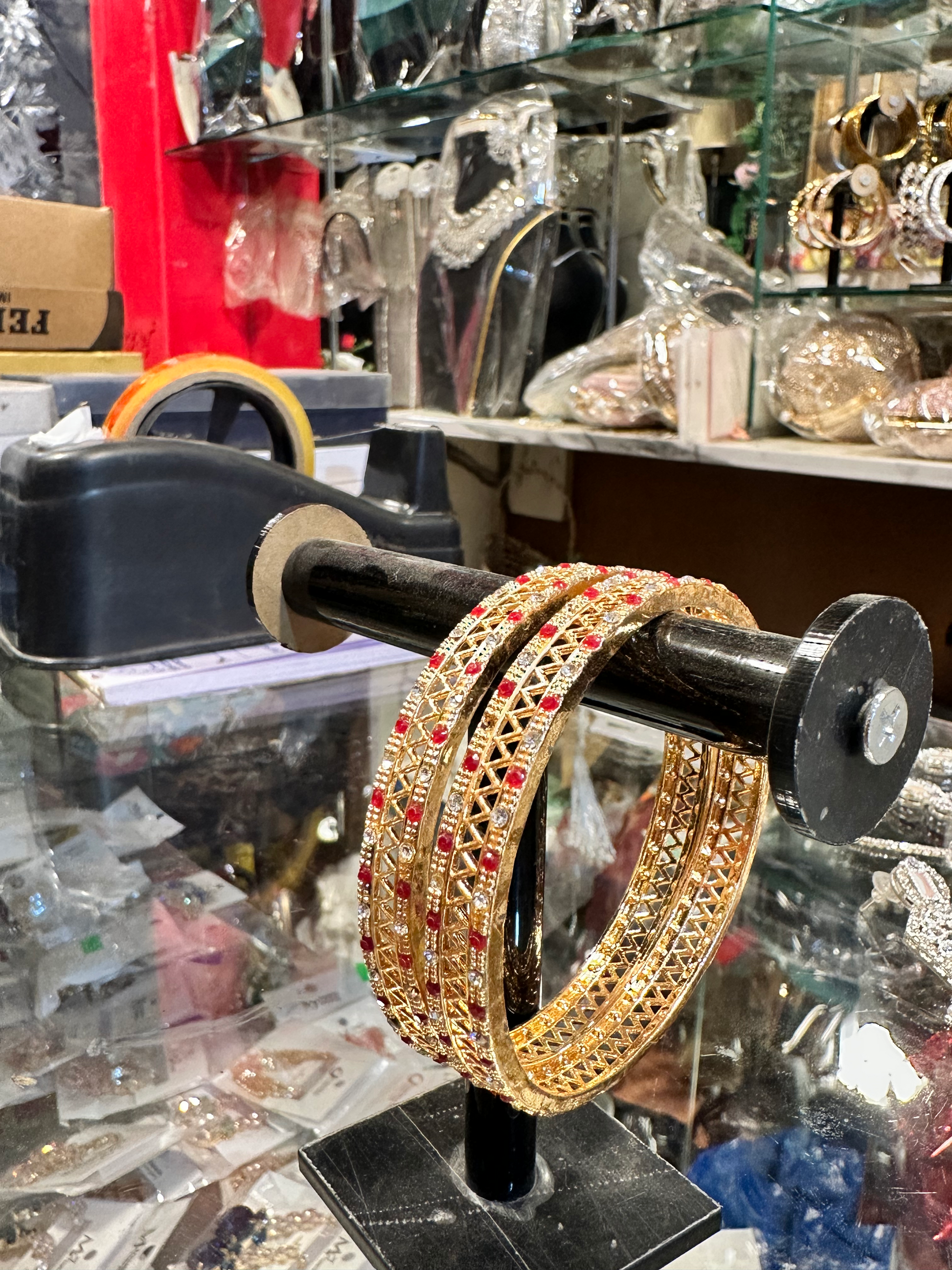 These bangles feature a detailed lattice (jali) pattern embellished with red and white stones, creating a rich and traditional appeal β ideal for weddings, festive functions, or special occasions.