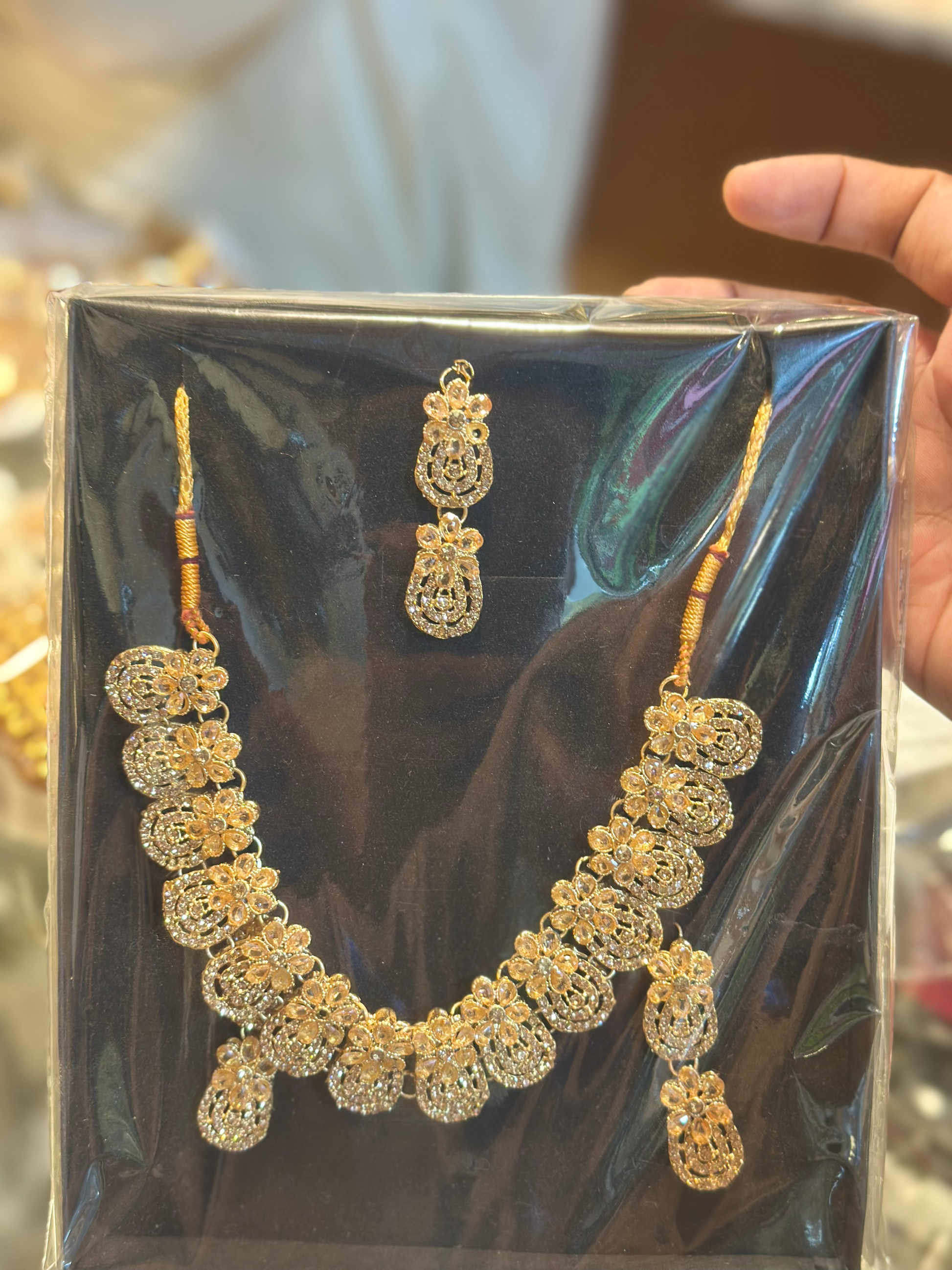 The necklace features intricately carved flower motifs with sparkling stones, paired with matching earrings — making it perfect for weddings, parties, or festive events.